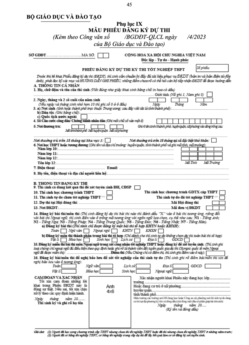 Phiếu đăng ký dự thi tốt nghiệp 2023